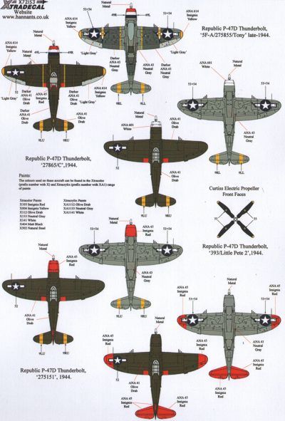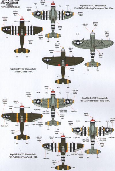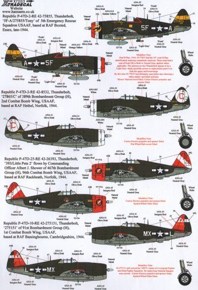 Xtradecal - 1/72 Republic P-47D Thunderbolts. They Also Serve. War Weary Bomber Formation Monitors and 5th Emergency Rescue Squadron (12) 41-6380/WW 448th Bomb Group Raf Seething two versions Mid and Late 1944, 41-6630/J 453rd Bg Raf Old Buckenham 1944, 42-7865/C 44th Bg Raf Shipdham, 42-8532/C 389th Bg Raf Hethel, 42-26393 'Little Pete 2' 467th Bg Raf Rackheath, 42-275151 91st Bg Raf Bassingbourne 1944, all Formation Monitors. 42-27922 5F-Z Raf Halesworth 1945, 42-8496 5F-X 'Galloping Catastrophe', 42-75855 'Tony' 3 versions, All 5th Emergency Rescue Squadron with red/white/blue nose cowl bands based at Raf Boxted.