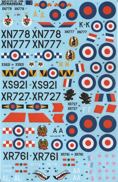 Xtradecal - 1/72 . BAC/EE Lightning (7) Lightning F.2A XN778/A 'KIng Cobra' 92 Sqn CO W/Cdr Ed Durham RAF Gutersloh 1977, XN777/K 19 Sqn RAF Gutersloh 1976, Lightning F.6 XS921/M 74 Sqn RAF Tengah, Singapore 1970, XR727/F 11 Sqn RAF Binbrook 1978, XR761/A 56 Sqn W/Cdr A.L.Buckley RAF Akrotiri and Wattisham 1975, XS919/AL 5 Sqn RAF Binbrooke 1984, XR770/AA 5 Sqn W/Cdr M.V.Streton RAF Binbrooke 1985 with Shark Mouth applied on APC at RAF Akrotiri.