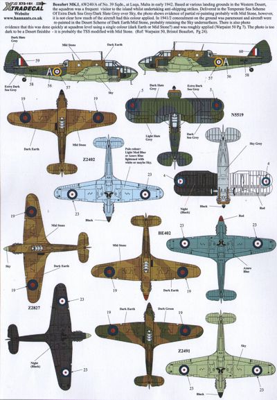 Xtradecal - 1/72 The Battle for Malta RAF - Gloster Gladiator N5519/R 1940; Hawker Hurricane IIa Z2403 GL-P 185 Sqn 1941; BE402 LE-S 242 Sqn; Z2827/M Malta Night Fighter Unit; Z2491 HA-D 126 Sqn Sgt Greenhalgh; Supermarine Spitfire Mk.Vb AB262 GN-B 249 Sqn F/O Robert McNair 1942; BP964 X-I 601 Sqn Sgt Dickson; BR294 GL-E 185 Sqn; BR321 GL-J 185 Sqn Flt.Lt John Plagis; Bristol Blenheim IV V6014 GB-J 105 Sqn; Beaufighte IC T3317 XK-? 272 Sqn S/Ldr A.W.Fletcher; Beaufort Mk.I AW340/A 39 Sqn