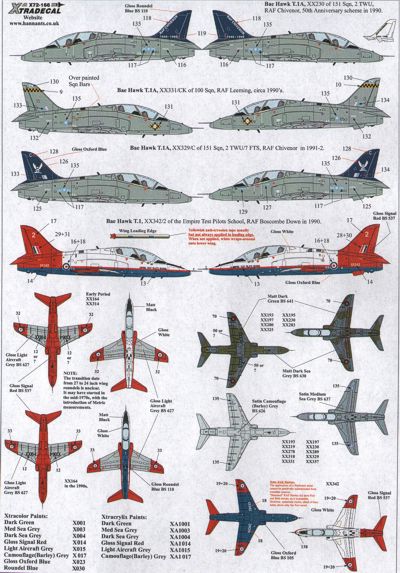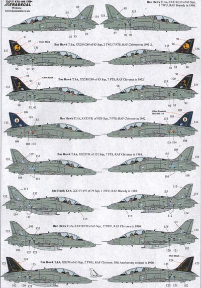 Xtradecal - 1/72 Ex X72095. Revised and renumbered BAe Hawk T.1A 1979-1992 (28) Red/white/grey scheme XX164/164 CFS, RAF Valley 1979; XX314/314/S 4.FTS/151 Sqn RAF Chivenor 1987; Red/white/blue/grey scheme XX164/164 4FTS 1990 or 100 Sqn 1993; Dk.Green/Dk Sea Grey camouflage XX230/129 or XX280/142 or XX195/195 63 Sqn 1979-86; XX197/112 1979 or XX193/193 1991 234 Sqn; XX325/X or XX283/X main and reserve display aircraft flown by Flt.Lt.Simon Meade 1989; XX280/280 79 Sqn RAF Brawdy 1982; Med.Sea Grey/camouflage grey scheme XX193/193 234 Sqn; XX289/289 or XX219/219 19 Sqn Light Blue fins 1992; XX318 234 Sqn Brawdy 75th Anniversary black fin with Welsh Dragon; XX219/219 63 Sqn 1986; XX289/289 63 Sqn black fin 1991 Axe on yellow disc or 1992 yellow axe; XX337/K 151 Sqn 1984 or 92(R) Sqn blue fin 1992; XX197/197 79 Sqn 1983; XX278/278 63 Sqn 1990; XX230 151 Sqn blue fin and XX278 63 Sqn black fin both in RAF Chivenor 50th Anniversary scheme; XX331/CK 100 Sqn 1990; XX329/C 151 Sqn blue fin with owl 1991-2; XX342/2 ETPS Boscombe Down 1990 Raspberry Ripple scheme Was X72095, now modified and reprinted.