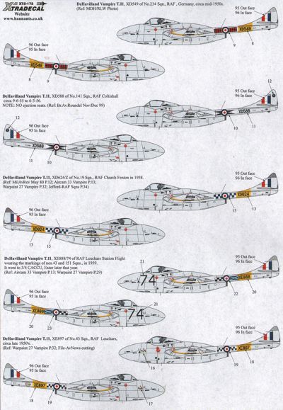 Xtradecal - 1/72 de Havilland Vampire T.11 UK Part 1 (14) WZ421/X 62 Sqn 1957; WZ467/Z 28 Sqn RAF Kai Tak, Hong Kong 1956; WX589 56 Sqn RAF Waterbeach 1955; XD429/28 RAF College, Cranwell 1957; WZ584/K Central Air Traffic Control School RAF Shawbury 1970; XD549 234 Sqn RAF Germany 1950s; XD588 141 Sqn RAF Coltishall 1955; XD624/Z 19 Sqn RAF Church Fenton 1958; XE888/74 RAF Leuchars Station Flight with markings of 43 and 151 Sqns 1959; XE897 43 Sqn RAF Leuchars 1950s; XE960 8 Sqn RAF Khormaksar, Aden 1958; XH359/X 45 Sqn RAF Butterworth, Malaya 1956; XA160 Flag Officer Flying Training FAA RNAS Yeovilton 1962; XG743.798/BY RNAS Brawdy Station Flight 1970; For NEW Airfix kit.