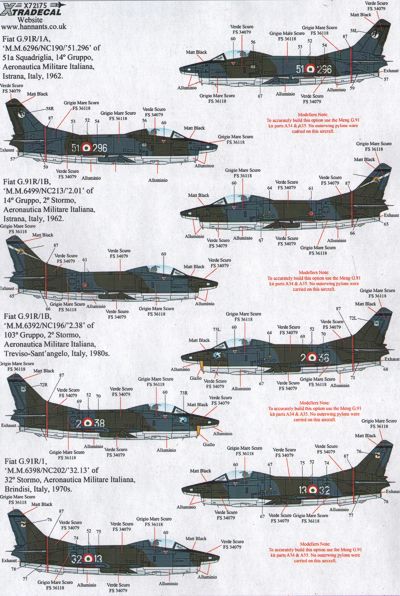 Xtradecal - 1/72 Fiat G.91R/3 (13) Luftwaffe 31+97 Waffenschule, Furstenfeldbruck 1962; MC+103 Leichtes Kempsfgeschwader 43 Oldenberg 1967; 30+68 Kempsfgeschwader 44 Leipheim 1968 all Green/Grey camo; Forca Aerea Portuguesa. 5425 Esquadra 702 'Escorpioes' Mozambique 1970; 5445 75000 Horas 1965-93 Esquadra 301 Jaguares 1993, Both overall natural metal; 5415 Esquadra 303 Tigres 1980s; 5448 Esquadra 301 Jaguares 1986, both overall Dark Green/Tan; 5410 Esquadra 302 Falcões Mozambique 1967-74 overall dark green; Italy 51-296 51a Sqn 1962; 2-01 14 Gruppo 2 Stormo lo-viz 1962; 2-38 103 Gruppo 1980; 13-32 32 Stormo 1970s, all green/grey/aluminium camo; R. Hellenic AF 10109/109 1961 green/grey/blue camo.