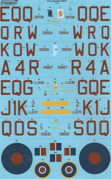 Xtradecal - 1/72 Avro Lancaster B.Mk.II 1943 (7) DS708 EQ-Q 'Queen of Spades'; DS708 EQ-G 'Goose/Miss Kingsville' Both 408 (Goose) Sqd RCAF Linton-on-Ouse; DS604 QR-W 61 Sqn RAF Syerston; DS620 KO=W b Flight 115 Sqn RAF East Wretham; DS827 A4-R C Flight 115 Sqn RAF East Wretham; LL670 JI-K2 514 Sqn with yellow fin bands RAF Waterbeach; DS830 QO-S 'Bobby Boy' 432 Sqn RCAF RAF Eastmoor.