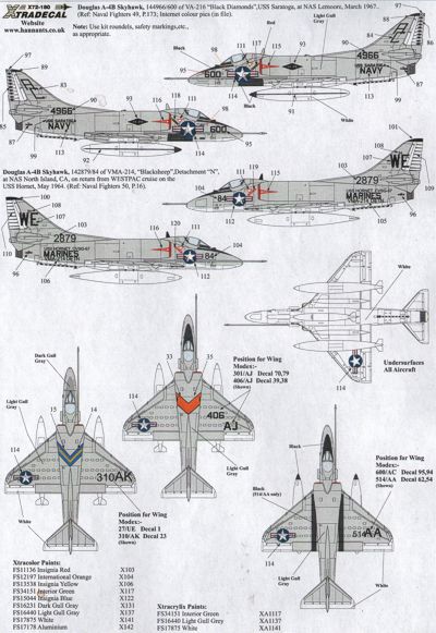 Xtradecal - 1/72 Scale Douglas A-4B Skyhawk Part 2 ((7) 1428748 UE/27 VC-5 Checker Tails Cuba Point 1967; 142693 AK/310 VA-12 Flying Ubangis Uss Essex 1966; 144930 AJ/406 VA-81 Crusaders US Essex 1961; 142676 AA/514 VA-152 Fighting Aces Uss Forrestal 1960; 145001 AJ/301 VA-83 Ramagers Uss Forrestal 1960; 144966 AC/600 VA-216 Black Diamonds Uss Saratoga at Nas Leemore 1967; 142879 WE/84 VMA-214 Blacksheep Na North Island after Wetpac on Uss Hornet 1964.