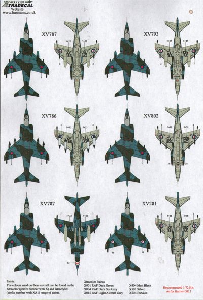 Xtradecal - 1/72 Hawker Siddeley Harrier GR.Mk.1/3 (10) XV753/53 OCU Wittering 1970; XV75 OCU at Biggin Hill Air Show 1969; XW745/27 233 OCU Wittering 1974; V762/44233 OCU Wittering 1975 winter camo; V787/A 1(F) Sqn Gutersloh 1970s;XV793/ 3(F) Sqn Gutersloh 1970s; XV786/E IV(AC) Sqn Gutersloh 1975; XV802/XX 20(R) Sqn Wildenrath 1971; XV787/02 1(F) Sqn ''Hot to Trot' with shark mouth Belize 1975; P1127 X281/E flown on carrier trials on HMS Eagle 1970.