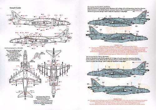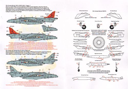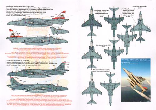 Xtradecal - 1/72 UK Air Arm Update Harrier Retirement (17) All the Harriers that took part in the final flypast on 15 December 2010. GR.9 ZG506 77A Gp Capt Gary M.Waterfall Joint Force Harrier Commander; ZG857 EB-Z W/C David Bradshaw OC Ops RAF Wittering; ZD379/27; ZG862/94; ZG502/73; ZG858/90 4® Sqn special tail markings; GR.9A ZD467/57A; ZG477/67A with 1(F) Sqn red/white tail markings; ZD433/45A; ZG472/62A; ZD351/18A 800 NAS red fin; ZD347/14A; T12A ZH665/113; ZH659/107; ZH664/112; ZH657/105. Inc instruction booklet and national insignia and stencil data for all Harriers. Was Model Alliance/ Airframe 72218.
