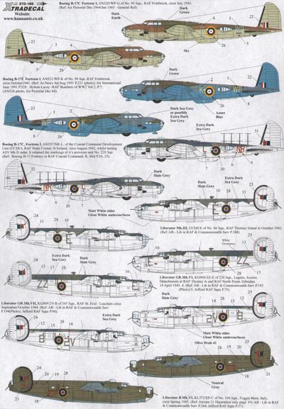 Xtradecal - 1/72 Scale Yanks with Roundels Part 5 (7) Raf Coastal Command Heavies B-17C Fortress I AN520 WP-G Ck Green/Dk Earth/Sky; AN521 WP-K Dk Green/Dk Sea Grey/Azure Blue. Both 90 Sqn Raf Polebrook 1941; AN537 NR-L Coastal Command Development Unit Dk Slate Grey/Ex Dk Sea Grey/White Raf Nutts Corner Nth Ireland 1942; B-24D Liberator Mk.III LV345/E 86 Sqn Raf Thorney Island Oct 1942; B-24J Liberator GR.Mk.VI KG904 ZZ-E 220 Sqn Azores 145; Liberator GR.Mk.VII KG869 2V-B 547 Sqn Raf St. Eval All Dk Slate Grey/Ex Dk Sea Grey/White; Liberator B.Mk.VI KL372 EP-C 104 Sqn Olive Drab/Neutral Grey Italy 1945