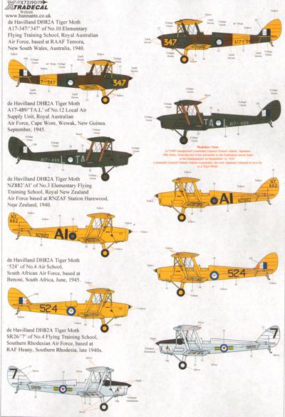 Xtradecal - 1/72 de Havilland DH.82A Tiger Moth (10) K4288 /D 18 Elementary and Reserve FTS, Fairoaks, Surrey 1837; DF184/G No 5 Glider Training School,Shobdon 1943; T7899 'RUD-A' Oxford University Air Squadron, Abingdon 1946; T7189 'LIA' 780 NAS 1943; A17-56/56 6 Elementary FTS RAAF Mallala, S. Australia 1940; A17-347/347 10 EFTS RAAF Temora NSW 1940; A17-489 TA-L 12 Local Air Supply Unit RAAF Cape Wom, Wewak, New Guinea 1945; NZ882/AI 3 EFTS RNZAF Harewood NZ 1940; 524 4 Air School SAAF 1945; SR26/7 4 FTS S. Rhodesian AF 1940.