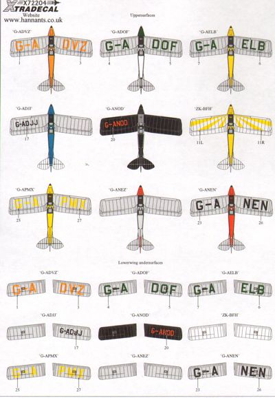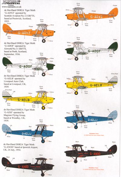 Xtradecal - 1/72 de Havilland DH.82A Tiger Moth Pt 2 in Colourful Civil schemes. (9) ZK-BFH Croydon Aircraft Works, Manderfield Airfield New Zealand 2006 Yellow/Silver, G-APMX K.B.Palmer, Popham, Hants 1980 Yellow/Silver, G-ANEZ Isle of Wight Gliding Club 1969 Red/Silver, G-ANEN Berkshire 2009 Red/Silver, G-ADVZ Scottish Aviation 12ERFTS, Prestwick, 1935 Orange/Silver, G-ADOF Airwork/11ERFTS Perth, Scotland 1936 White/Silver, G-AELB Liverpool Aero Club 1939 Yellow/Silver, G-ADJJ Magister Flying Group, Woodley 1939 Blue/Silver, G-ANOD Ipswich 1954 Overall Black.