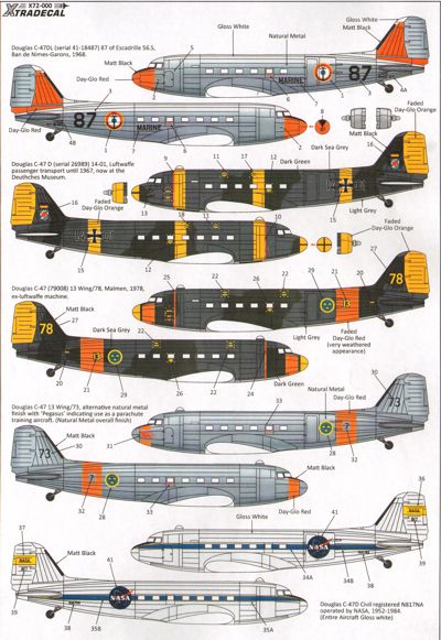 Xtradecal - 1/72 Douglas C-47 International Liveries (7) French Marine 41-18487/87 Escadrille 56.S 1968, Luftwaffe 26989 14-01 1967 now at Deutches Museum, Sweden 79008 13 Wing/78 Malmen 1978 camoflaged, 13 Wing/73 overall natural metal, NASA N817NA overall white, Argentina TC-34 Falklands 1982 camoflaged, Canadian AF No.927 preserved at the Alberta Aviation Museum.