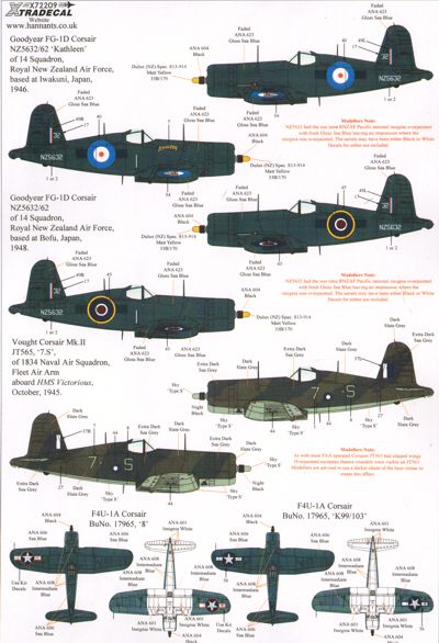 Xtradecal - 1/72 Scale Vought F4U-1 Corsairs (15) Usmc 17965/8 VMF-422 1st Lt.Stout 1944, 17965 K99/103 VMF-115 1944, 17656/2 MABG-2 Project Joe 1945, SS11 Service Sqn 11, MAG-11 Espiritu Santos 1945, 600 VMF-122 Werewolves 1st Lt. Don Wilson Peleliu 1945, Faa JT238 3BB 759 Nas Yeovilton 1943, JS479 BH2/Q 718 Nas Rnas Ballyherbert 1945, JT260 P54 757 Nas Hms Unicorn 1944, JT634 137/P 1834 Nas Hms Victorious 1944, J565 7-S 1834 Nas Ms Victorious 1945. Rnzaf NZ5469/469 W/O Bryan Cox New Britain 1945, NZ5471/471 Fl.Lt. Wally Jacobs New Britain 1945, NZ5272/NZ5307 307 No.1 Servicing Unit Guadalcanal 1944, NZ5632/62 14 Sqn 'Kathleen 2 versions,