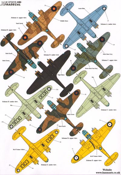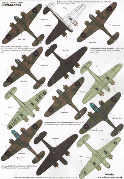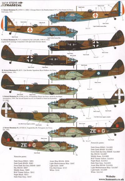 Xtradecal - 1/72 Bristol Blenheim and Bolingbroke Mk.IV/IVF RAF and Overseas Operators. Pt 3 (10) Z7513/R 15 Sqn SAAF Libya 1943, V5458 RT-O 114 Sqn West Rayham 1942, Z6279 EE-A 404 Buffalo Sqn RCAF Thorney Island 1941, Z9583/14 GRB 1 Free French AF Fort Lamy 1941, 5+5 Tested by Luftwaffe 1940-41, B268 32nd Bomber Sqn R. Hellenic AF Mendi, Greece 1941, N3589 ex RAF 40 Sqn Tested by Regia Aeronautica 1940, 267 ZE-G Esquadrilia ZE, Portuguese AF, Ota, 1944, Bolingbroke IV 9030 BK-V 115 Sqn RCAF Annette Island, Alaska 1942, 10103 Unit unknown RCAF St Hubert 1943 overall yellow.