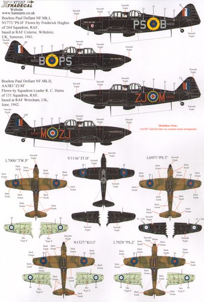 Xtradecal - 1/72 Boulton Paul Defiant Mks.1 (10) L7029 PS-Z 264 Sqn 1940, N3340 YD-D 255 Sqn 1941 both Kirton-in-Lyndsey, V1121 BA-O 277 ASR Sqd Stapleford Tawney 1942, V1110 RA-H 410 (Canadian) Sqn RAF Drem 1941, L7000 TW-P 141 Sqn Prestwick 1940, V1116 JT-H Colerne 1941, L6957 PS-T Duxford 1940, N1572 KO-I II(AC) Sqn Army Co-op Trials RAF Hatfield 1940, N1801 PS-B 264 Sqn Colerne 1941, AA583 ZJ-M 151 Sqn Wrexham 1942