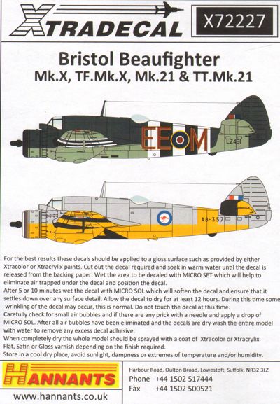 Xtradecal - 1/72 Bristol Beaufighter Mk.X X72227 Bristol Beaufighter Mk.X, TF Mk.X, Mk.21, TT Mk.21 (10) Mk.X KW393/W 27 Sqn Burma 1945, LZ293 RAF Coastal Command 1944, TF Mk.X NE686 EO-T 404 Sqn RCAF Flt/Off Flynn/ P/O Michael RAF Coastal Com RAF Dallachy 1945, LZ451 EE-M 404 Sqn RCAF Wg/Co Alfred Kitchener Gatward DSO D-Day stripes RAF Strubby 1945, NE425 2-G 404 Sqn RCAF RAF Davidstow Moor, Cornwall 1945, LZ293 MB-T 236 Sqn RAF Coastal Command RAF North Coates, Lincs 1944, Mk.21 A8-23 EH-C 31 Sqn RAAF Flt/Off /P/O Lyons Morotai 1945, A8-112 SK-L 93 Sqn RAAF Morotai Island, Borneo 1945 TT Mk.21 A8-265 30 (TT) Sqn Air Trials Unit RAAF Woomera 1957, A8-265 30(TT) Sqn RAAF Woomera 1948,