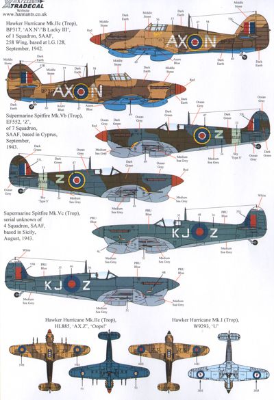Xtradecal - 1/72 Fighters Over Africa and the Mediterranean Pt.1 Hawker Hurricane Mk.I Tropical version W9293/U 75 Sqn RAF 1942, Hurricane Mk.IIc (Trop) HL885 AX-Z 'Oops' 1 Sqn SAAF 1942, BP317 AX-N 'B Lucky III' 1 Sqn SAAF 1942, Supermarine Spitfire Mk.Vb (Trop) EF552/Z 7 Sqn SAAF Cyprus 1943, JK792 WR-O 49 Sqn SAAF Italy 1844, Spitfire Mk.Vc(trop) KJ-Z 4 Sqn SAAF Sicily 1943, Spitfire Mk.IXc H904 AX-E 1 Sqn SAAF Italy 1944, SM143 KL-T Major M.V.Wally Brunton DFC 4 Sqn SAAF Italy 1945, North-American P-51B Mustang Mk.III FH244 OK-F 450 Sqn RAAF Italy 1945, P-51D Mustang Mk.IV KH716 CV-P 3 Sqn RAAF Italy 1945, Curtiss P-40N Kittyhawk Mk.IV FX666 CV-V 450 Sqn RAAF Italy 1944.