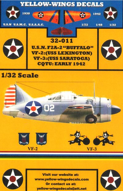 Yellow Wings - 1/32 Brewster F2A-2 Buffalo (3) 1418 2-F-13 5th Section Leader VF-2 U.S.S. Lexington 1940; 1432 3-F-17 2nd a/c 6th Section U.S.S. Saratoga 1941; Training a/c with early 1942 oversize National Insignia, tail stripes. Triple sheet set